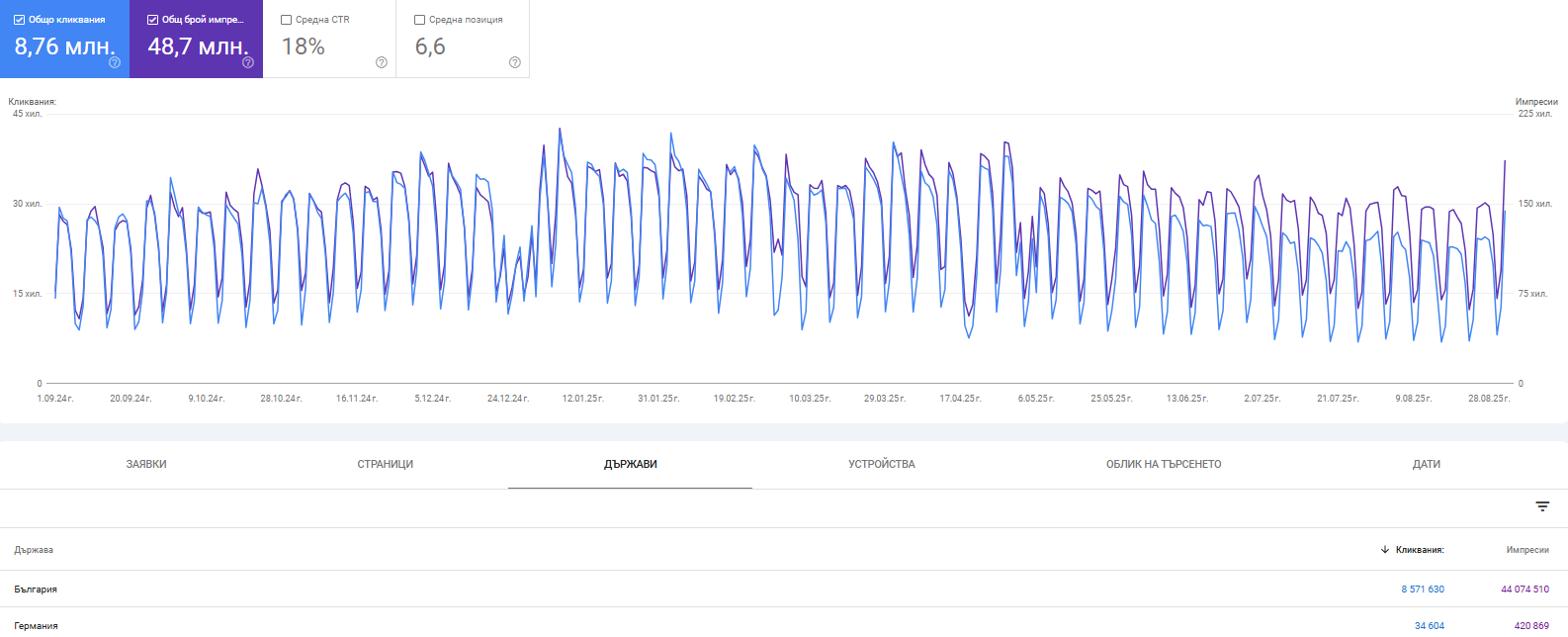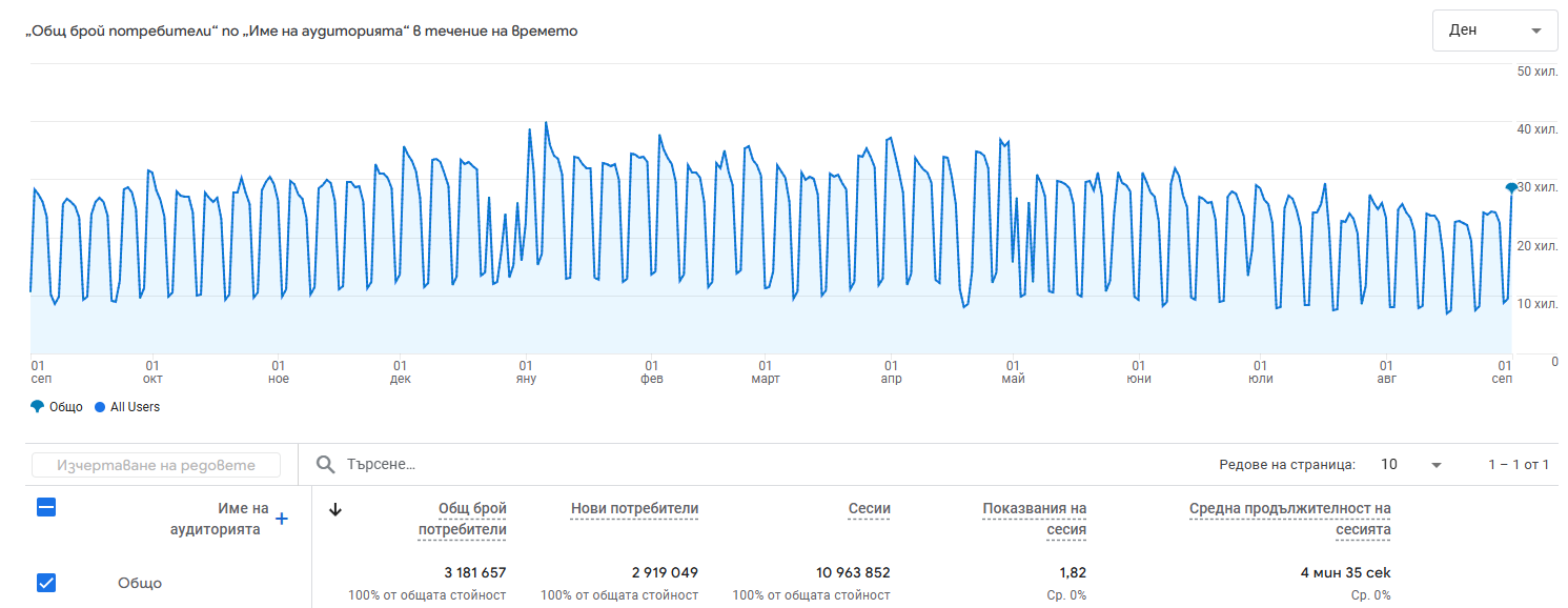 Данните от Google Analytics показват над 3.1 милиона реални потребители и близо 11 милиона сесии за последните 12 месеца. За сравнение, органичният трафик от търсачките надхвърля 8.7 милиона клика за същия период – виж графиката от Google Search →.